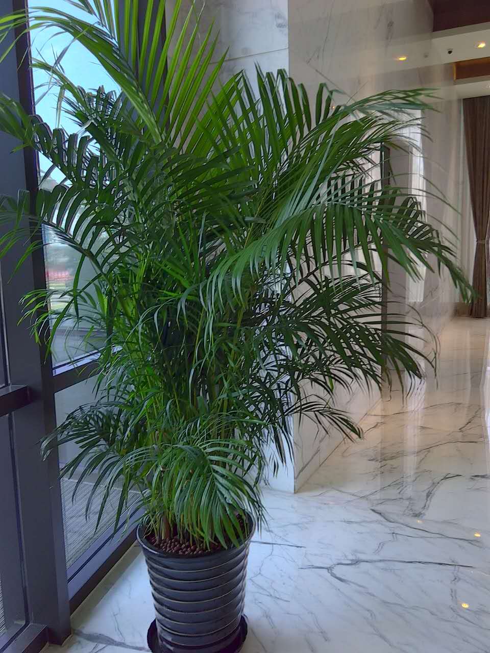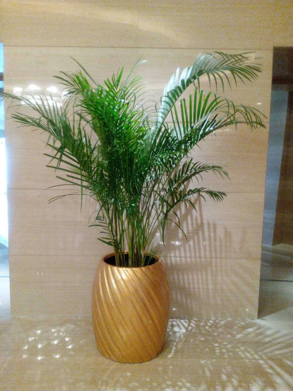 養(yǎng)護(hù):散尾葵怕寒冷,怕強(qiáng)光曝曬,以免灼傷葉片。散尾葵喜半陰環(huán)境,春、夏、秋三季應(yīng)遮去50%左右的陽光。生長適溫為20~25℃,冬季夜間溫度應(yīng)在15℃以上,白天25℃左右較好。若長時間低于5℃,必然受凍害,甚至死亡。在生長季節(jié),需經(jīng)常保持盆土濕潤和植株周圍較高的空氣濕度。冬季應(yīng)保持葉面清潔,可經(jīng)常向葉面少量噴水或擦洗葉面。生長季節(jié)每月施肥1~2次。對土壤要求不嚴(yán)格,但以疏松并含腐殖質(zhì)豐富的土壤為宜。盆栽散尾葵可用腐葉土、泥炭土加1/3的河沙或珍珠巖及基肥配制成培養(yǎng)土。每2~3年春季換盆一次,施上基肥。換盆時,應(yīng)清除枯枝殘葉,還應(yīng)根據(jù)生長情況,剪除過于密集的株叢,以利于信株叢的萌發(fā),保持優(yōu)美的盆栽姿態(tài)。